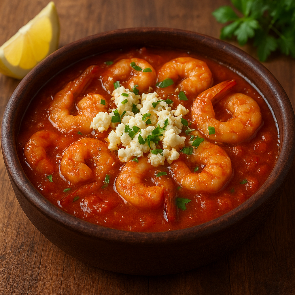 Garides Saganaki, Yunan mutfağının en sevilen deniz ürünü yemeklerinden biridir. 🏛️✨ Domates sosu, beyaz peynir (feta) ve zeytinyağı ile hazırlanan bu lezzetli güveç yemeği, genellikle meze olarak servis edilir. Hafif acılı ve aromatik yapısıyla sofralara Akdeniz esintisi getirir. 🌊🥗
