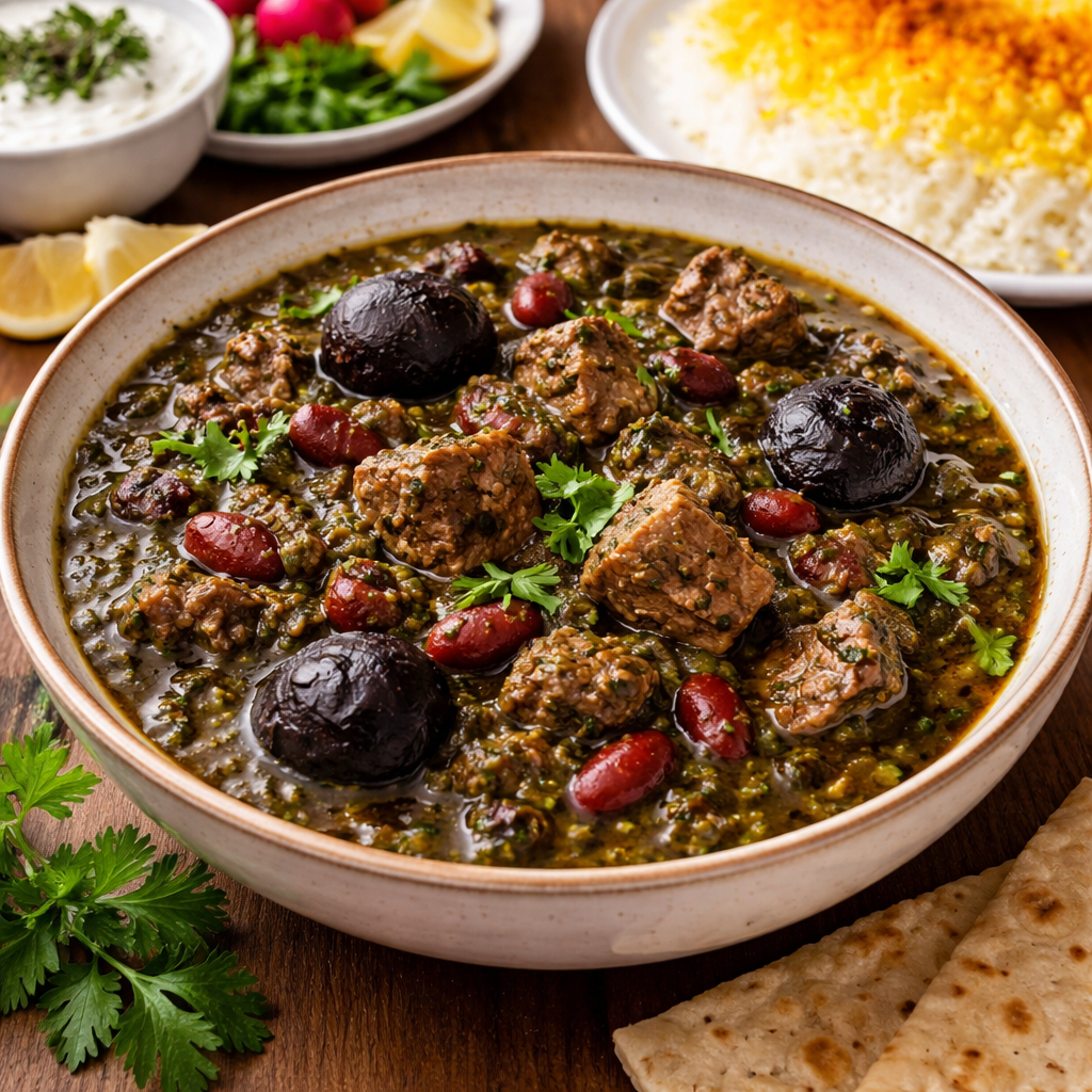 İran mutfağının en ikonik yemeklerinden biri olan Ghormeh Sabzi, bol yeşillik, et ve kuru limonun (limoo amani) eşsiz birleşimiyle hazırlanır.