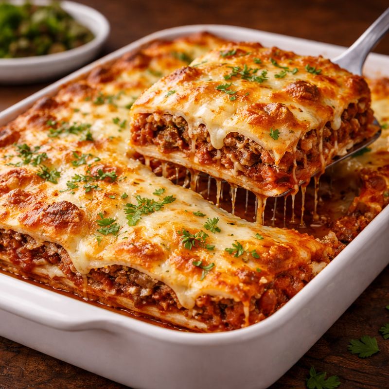 Lasagna; fırında pişirilen, çok katmanlı bir makarna yemeğidir. Klasik versiyonu Lasagna al Forno, kıymalı domates sos (Bolonez) ve beşamel sosla hazırlanır. Davet sofraları ve kalabalık aile yemekleri için idealdir.
