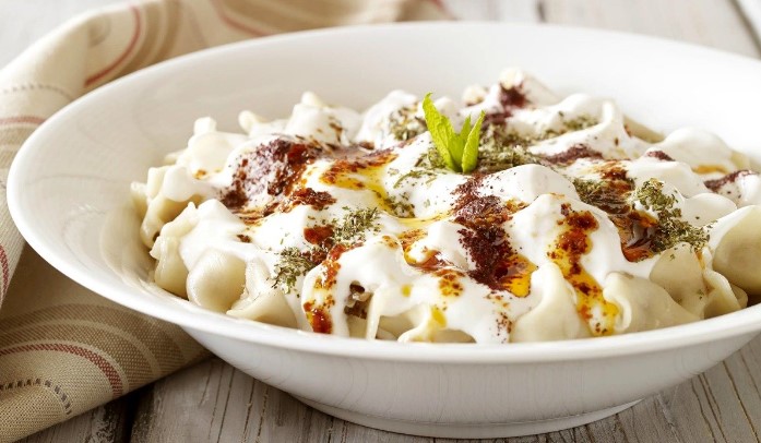 - Mantıları servis tabağına alın, üzerine önce sarımsaklı yoğurtu sonra tereyağlı sosu dökün.
