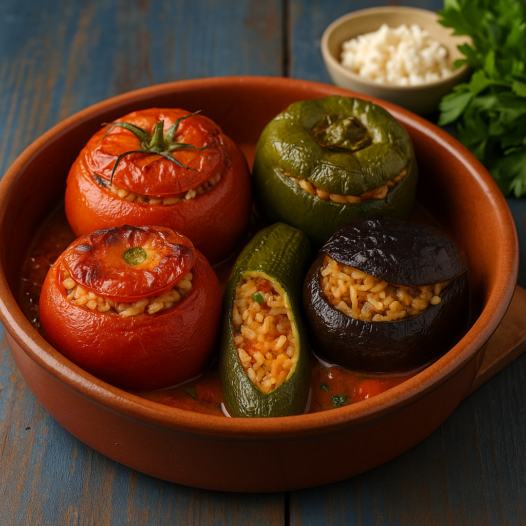 Yemista, Yunan mutfağının en sevilen geleneksel yemeklerinden biridir. 🇬🇷✨ Türk mutfağındaki dolma kültürüne benzer, ancak zeytinyağı ve Akdeniz otlarının aromasıyla farklı bir kimlik kazanır. İç harç pirinç, taze sebzeler ve baharatlarla hazırlanır; domates, biber, kabak veya patlıcan gibi sebzelerin içine doldurularak fırında pişirilir.